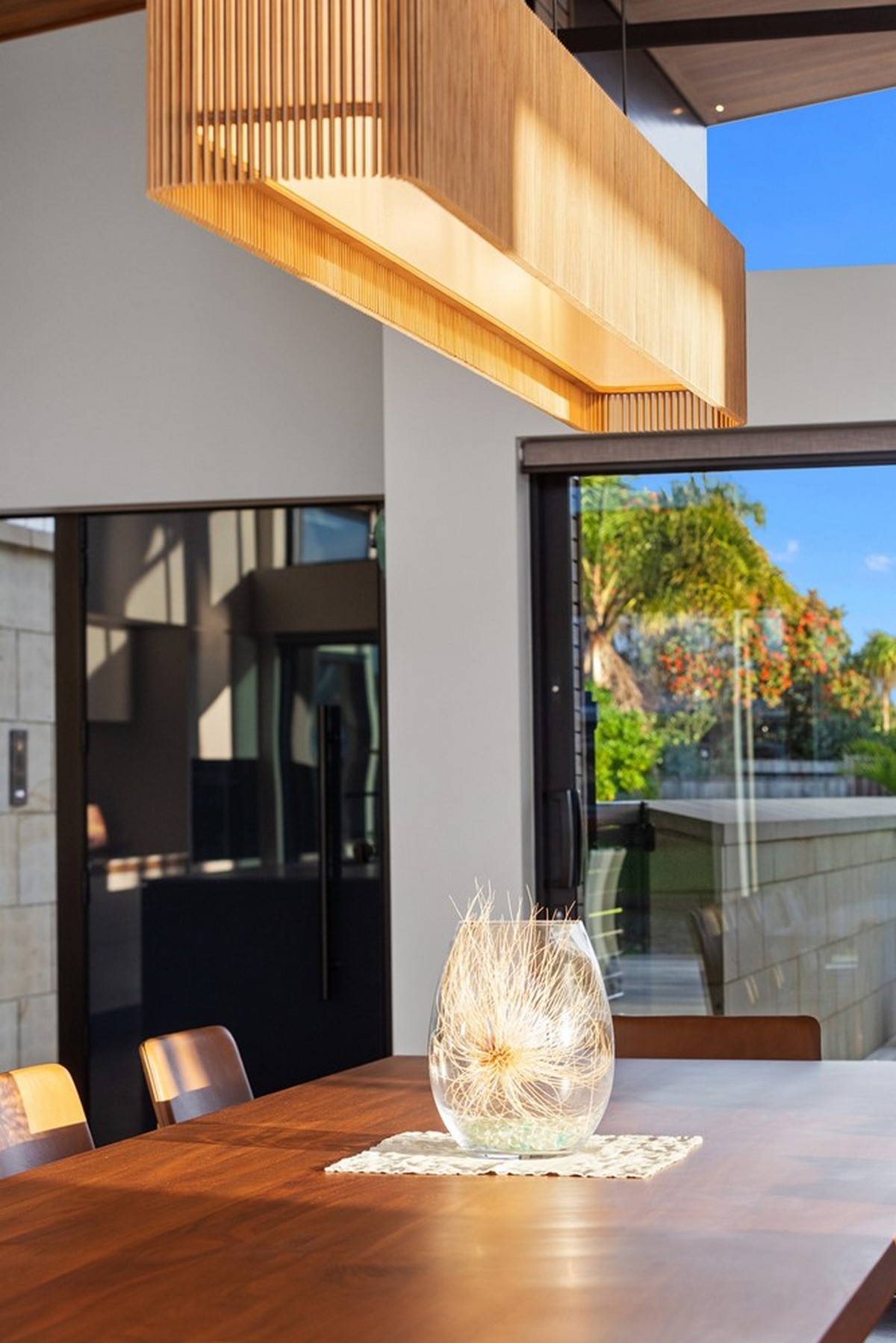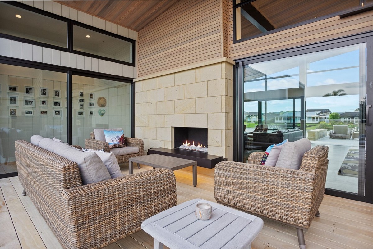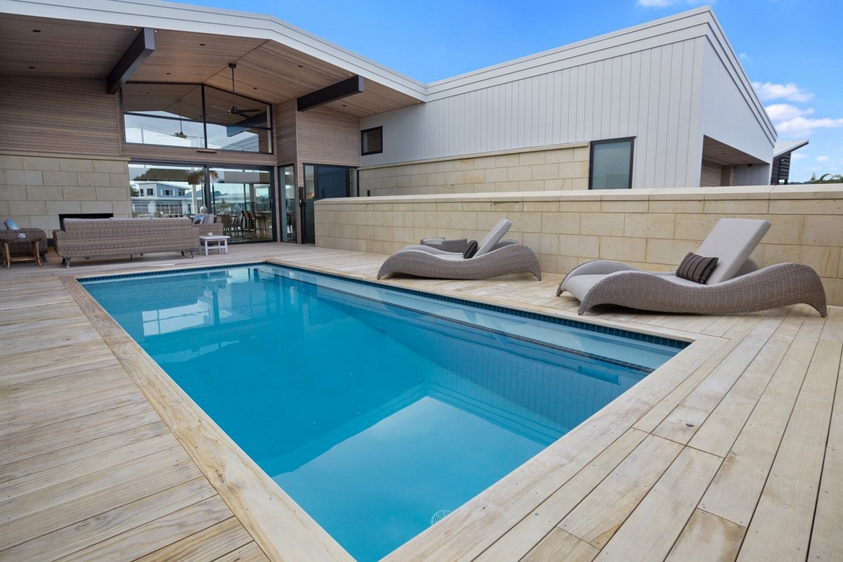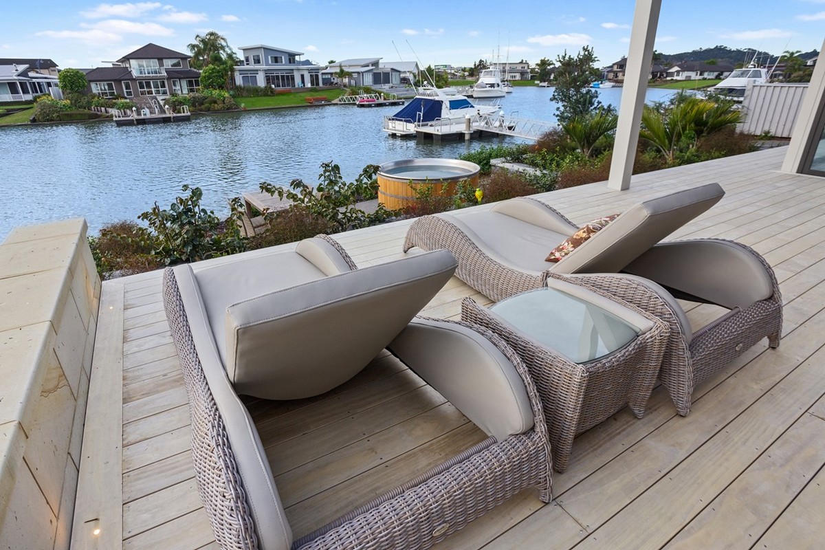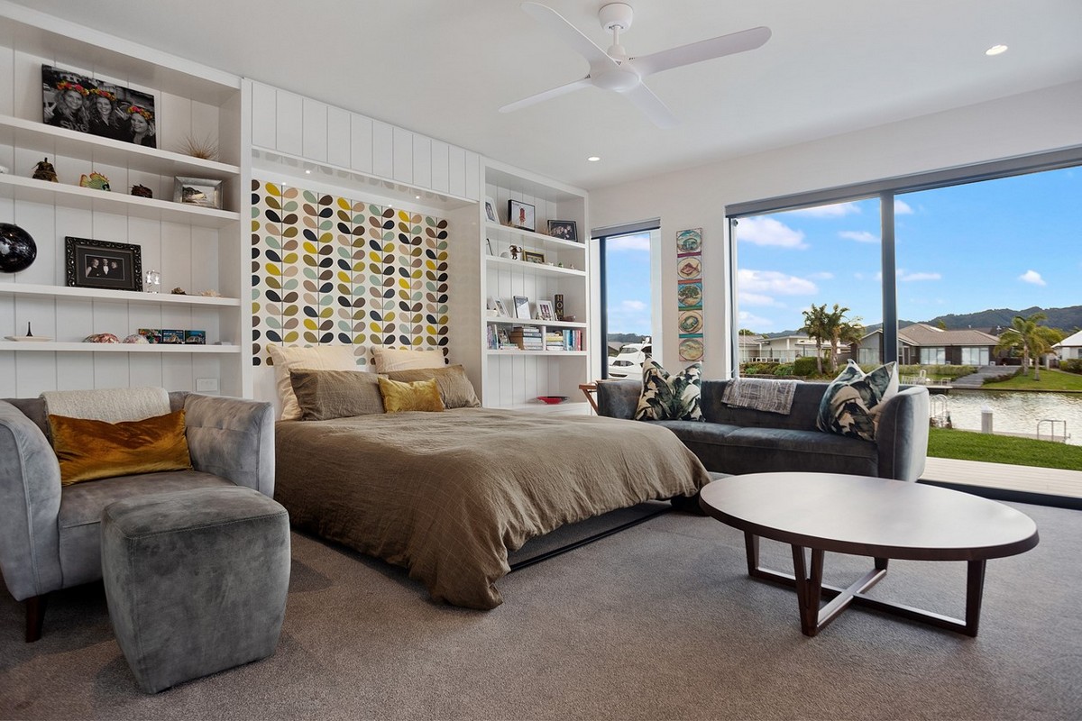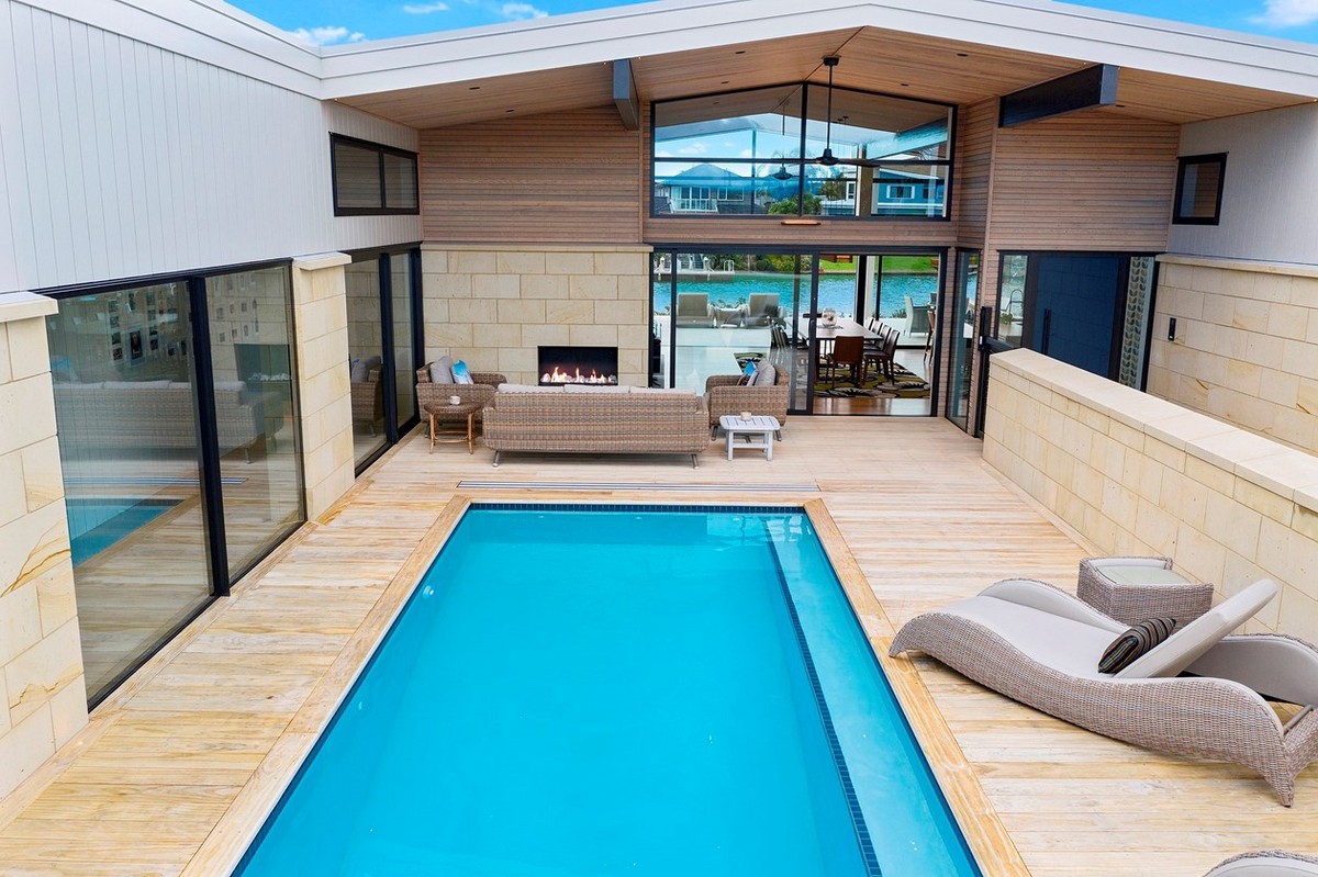 The exterior is a mix Hinuera stone, cedar batons and weatherboards, low maintenance and beautiful. All placed expertly to compliment the terraced landscape plan and allow the family to enjoy the benefits of living near the water. The options for entertaining outside are varied and include vast decks, a private poolside courtyard and sculptural garden steps that guide you down to the water or the hot tub.