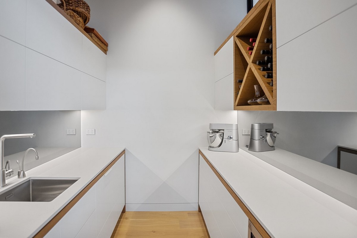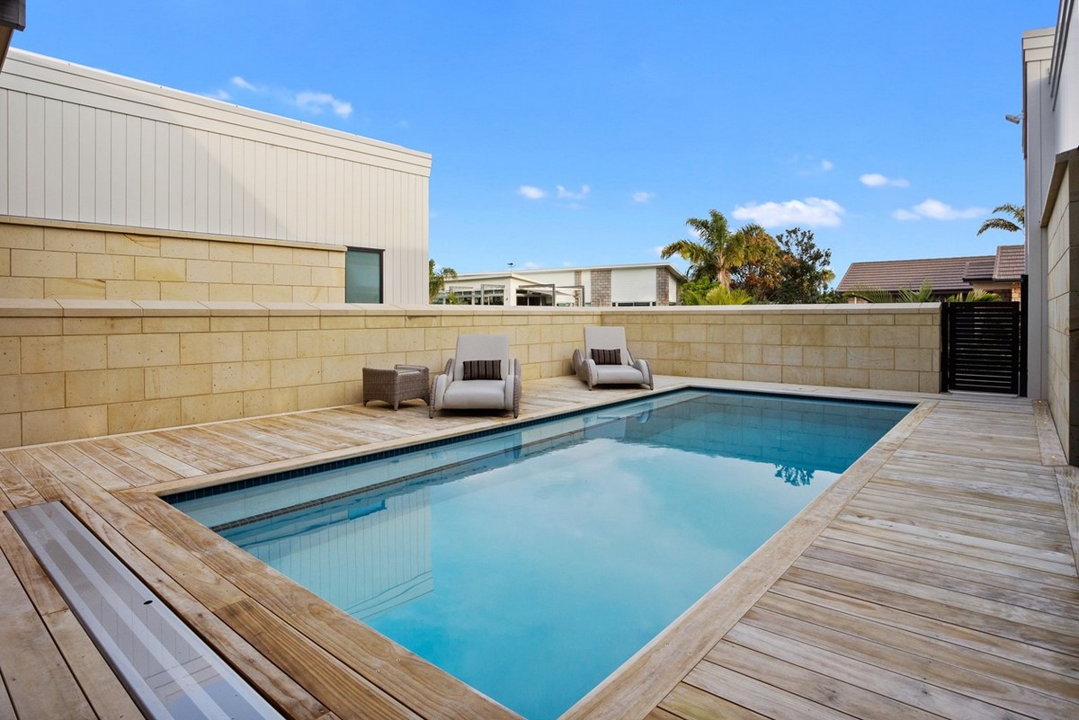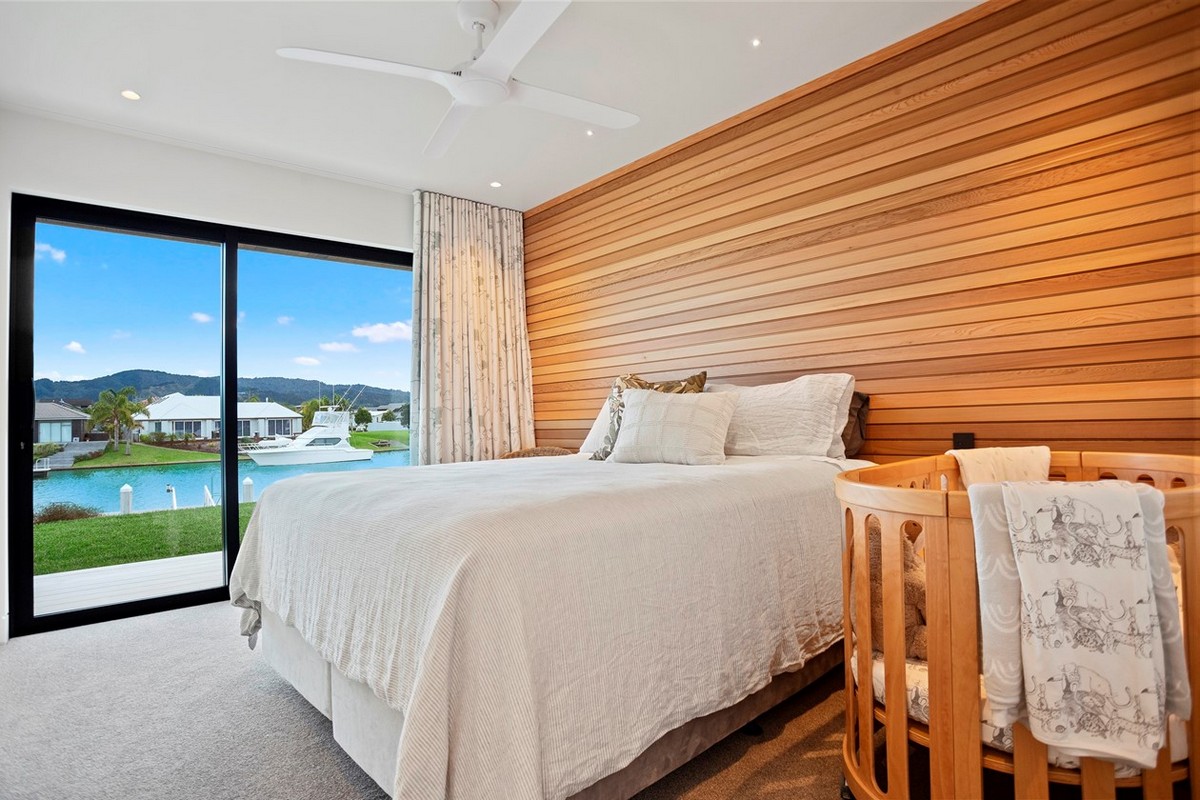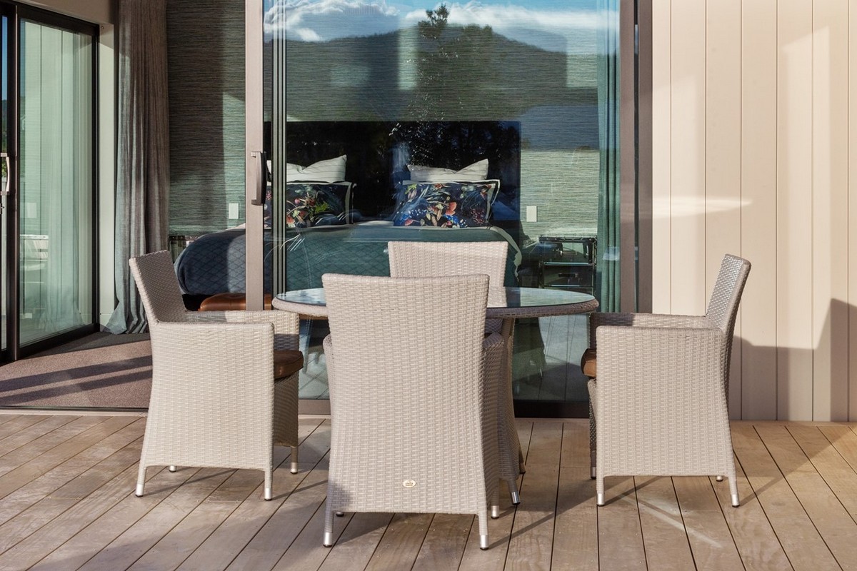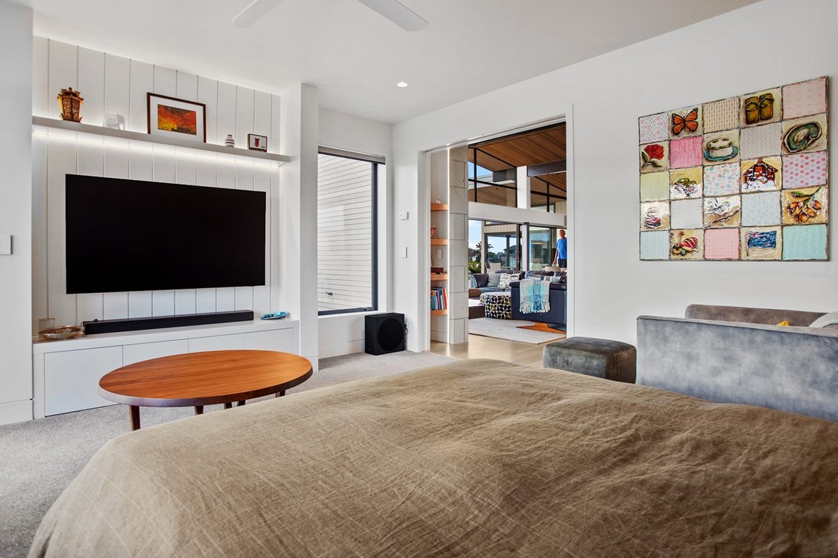 The exterior is a mix Hinuera stone, cedar batons and weatherboards, low maintenance and beautiful. All placed expertly to compliment the terraced landscape plan and allow the family to enjoy the benefits of living near the water. The options for entertaining outside are varied and include vast decks, a private poolside courtyard and sculptural garden steps that guide you down to the water or the hot tub.