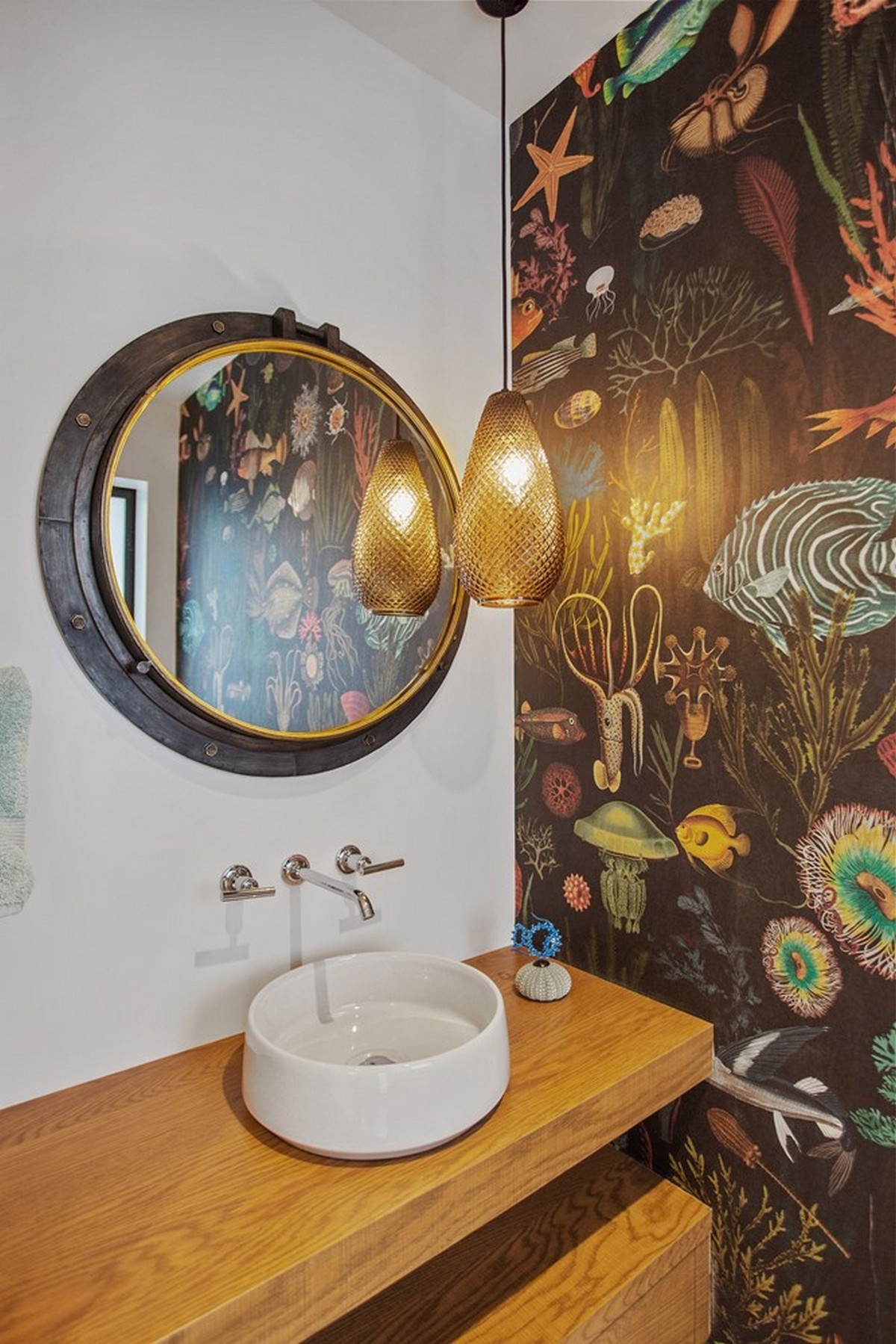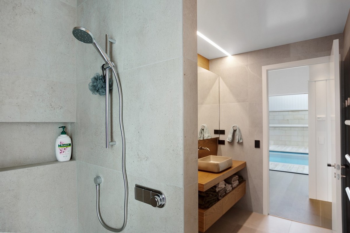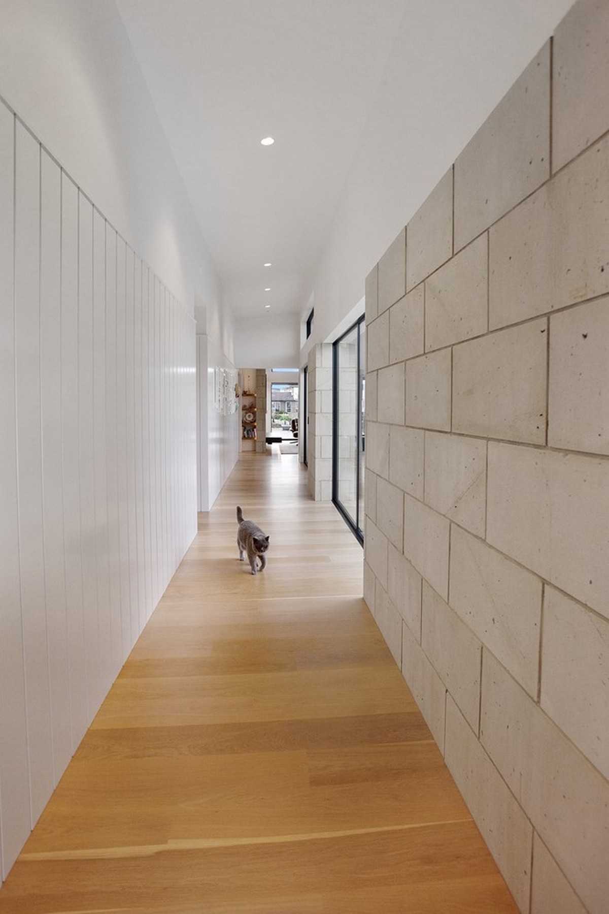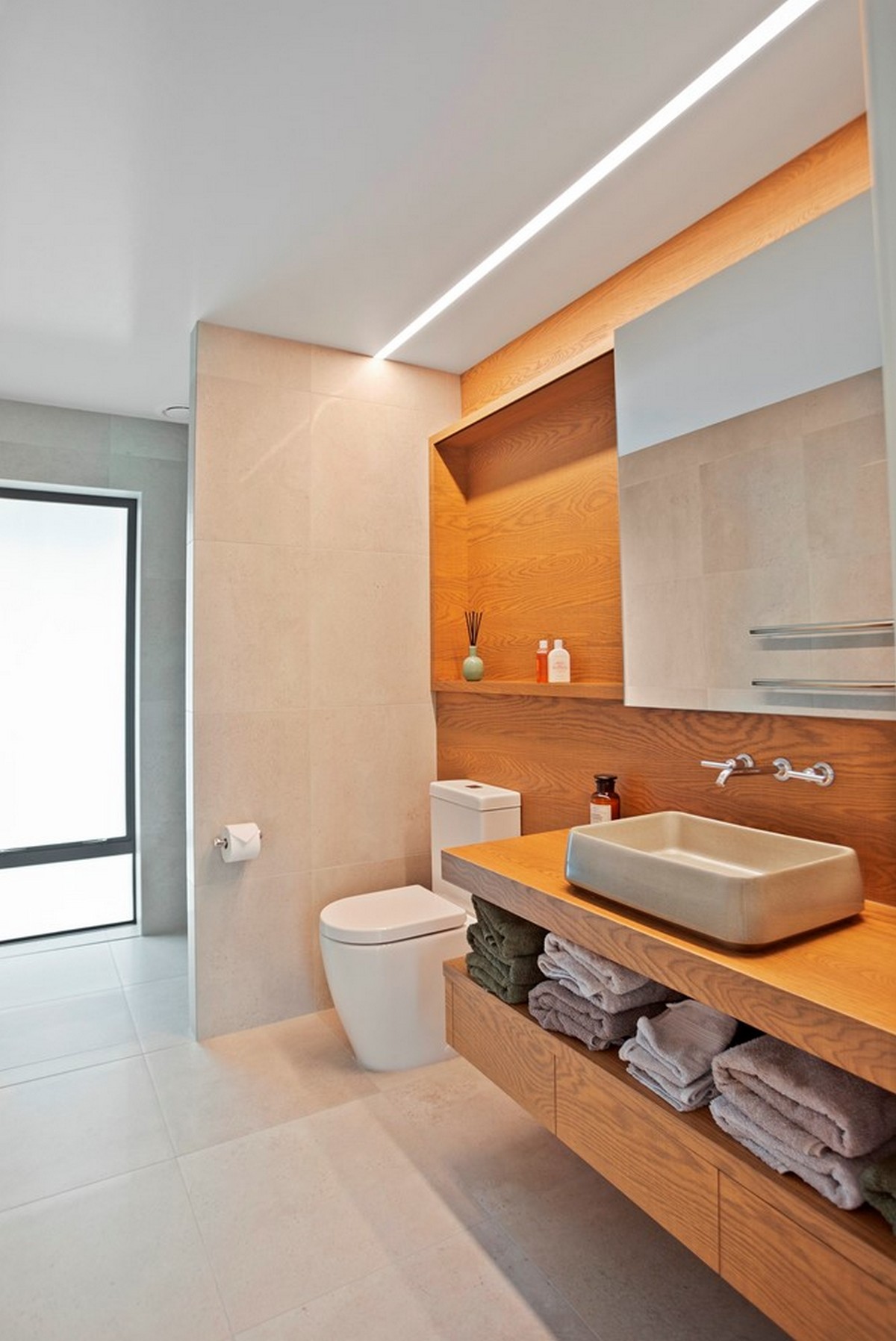 The three bedroom home is spacious and filled with light. The interior finish is sublime, with built in oak furniture, high raking wooden ceilings and hand poured concrete basins. It is a house that celebrates its position on the water and shows off an individual style that can only come about through precise, detailed construction.