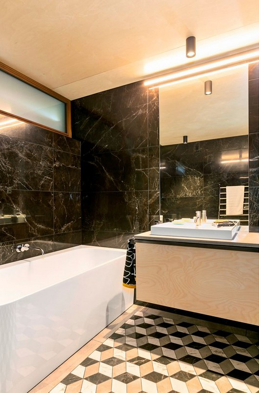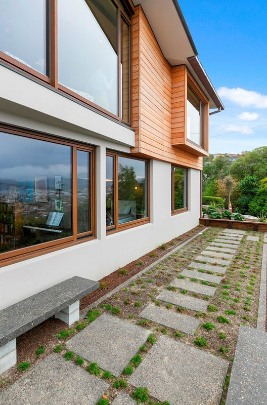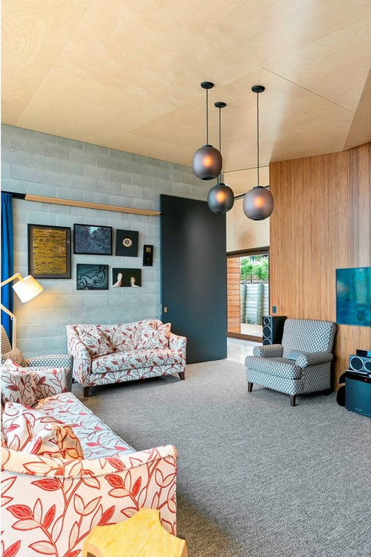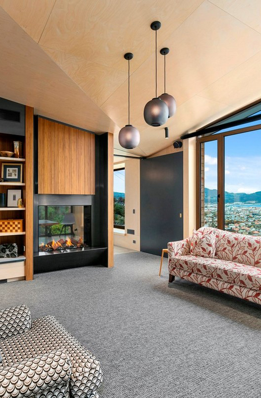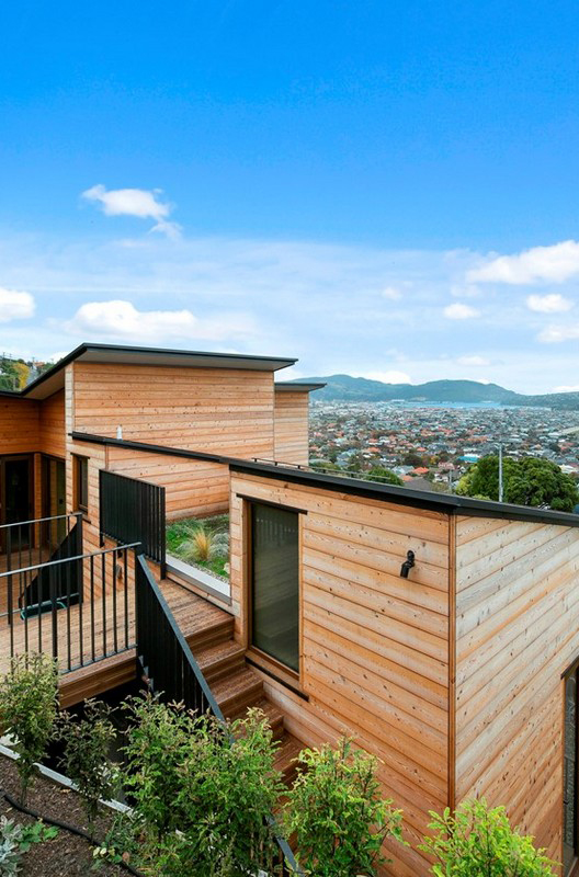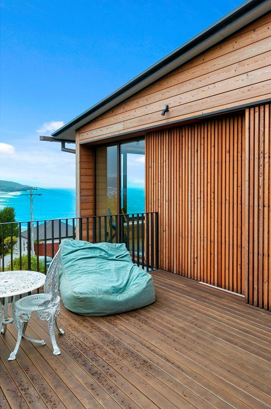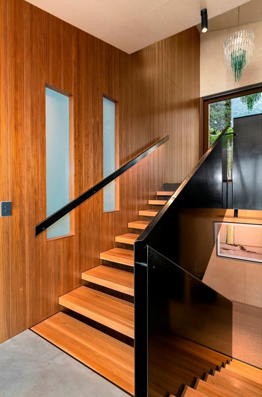 As a result, the dwelling, crafted in weatherboard atop concrete block, folds into the contours of its elevated section and sits discreetly in its landscape – not an easy feat given that there are four levels over which a complexity of living spaces are located.